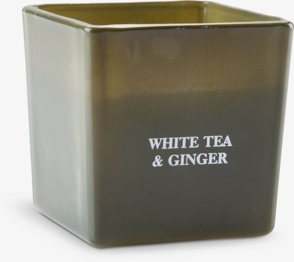 Ароматизована свічка в оливковому скляному контейнері. Ця свічка наповнить вашу оселю чудовими пахощами білого чаю та імбиру. З тривалістю горіння 15 годин, вона забезпечить тривалий аромат і освітлення. 8x8x8 см