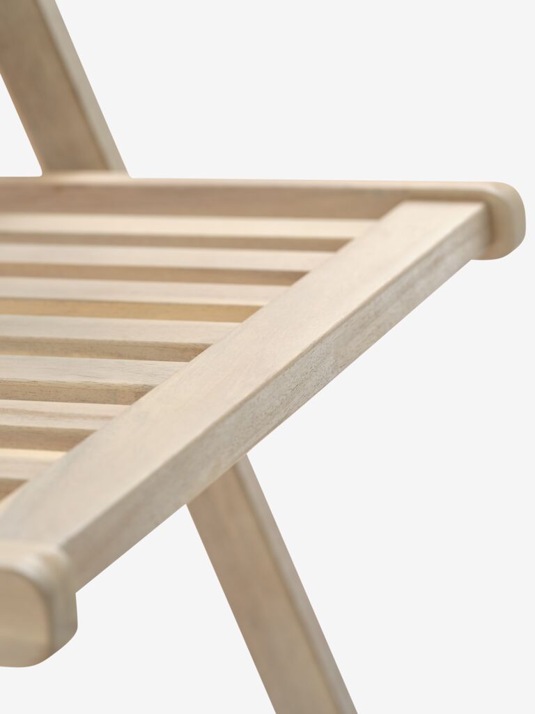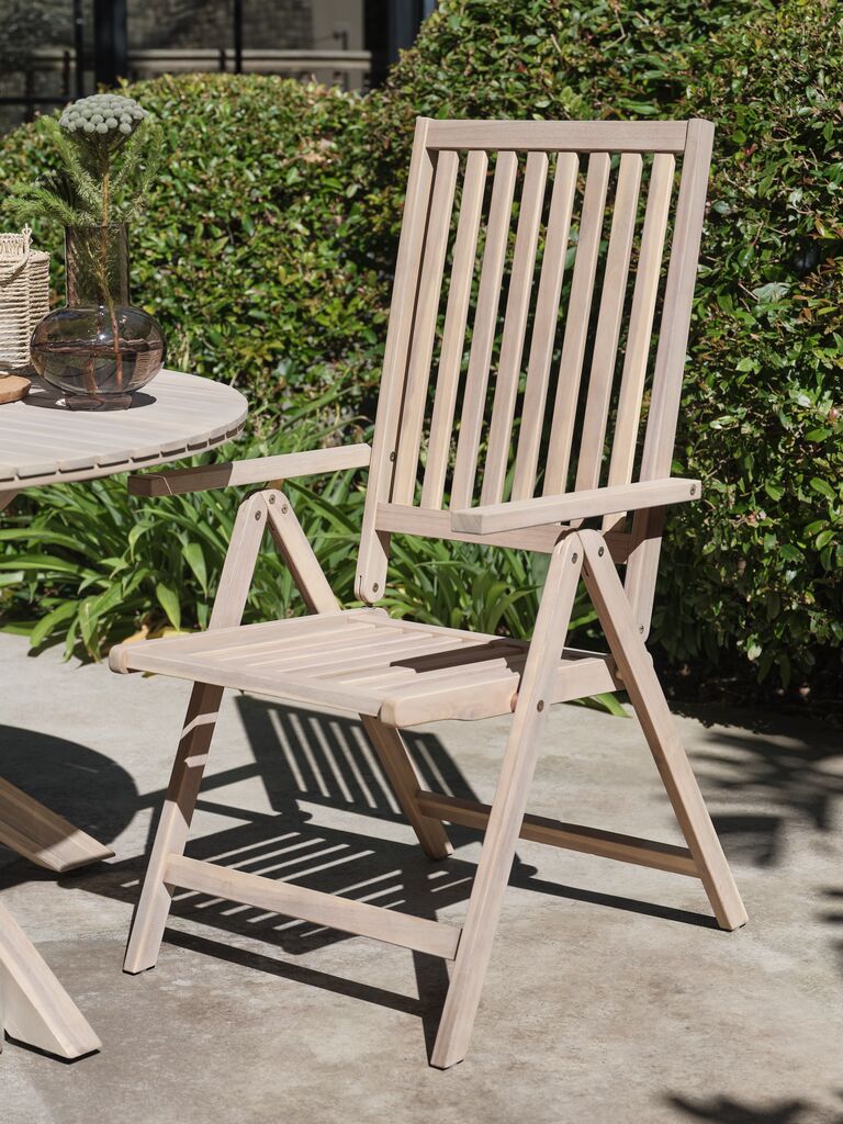 Багатопозиційний стілець із промащеного хардвуду FSC®. Спинку можна нахилити в 7 різних положень. Деревина оброблена спецальною олією для додаткового захисту та підкреслення природного кольору. Рекомендується регулярно змащувати деревину, щоб зберегти її колір і захистити від вологи. Стілець можна скласти для зручного перенесення та зберігання.