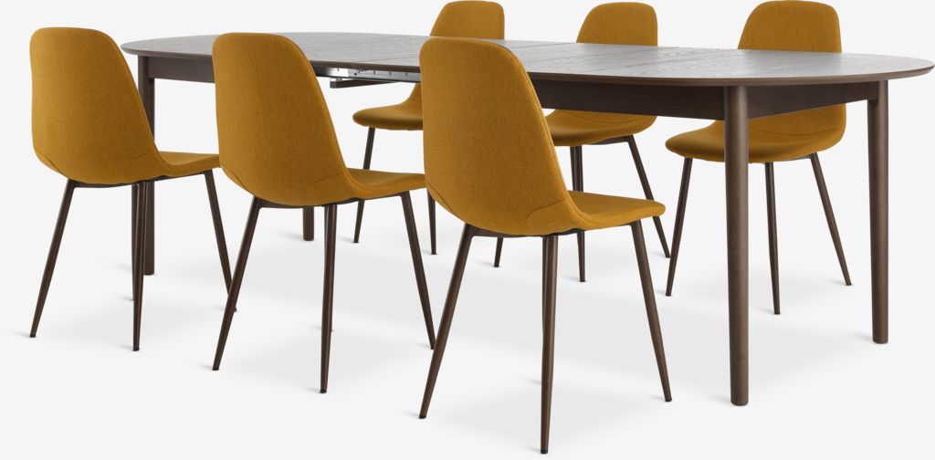 Стіл: дерево та шпон дуба. 100х200/240/280 см, вис. 75 см. Стільці: тканина та сталь
