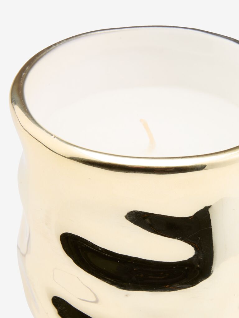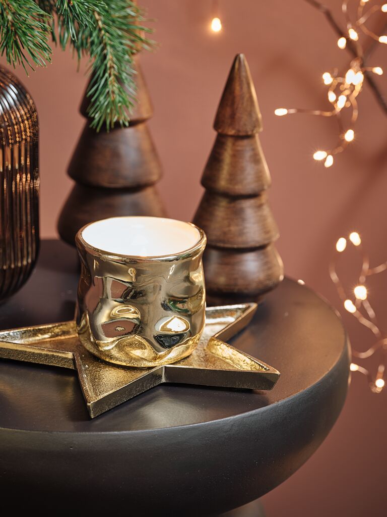 Свічка в керамічному горщику золотого кольору. Металеве покриття надає святкового сяйва, що робить її простою, але елегантною прикрасою на різдвяні свята. Діам. 8 см, вис. 7 см