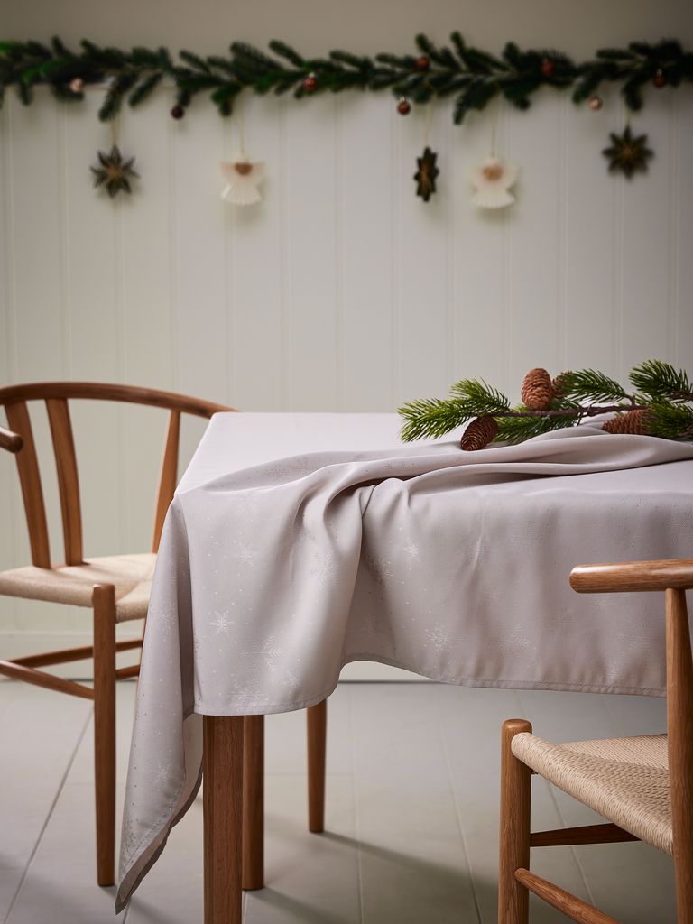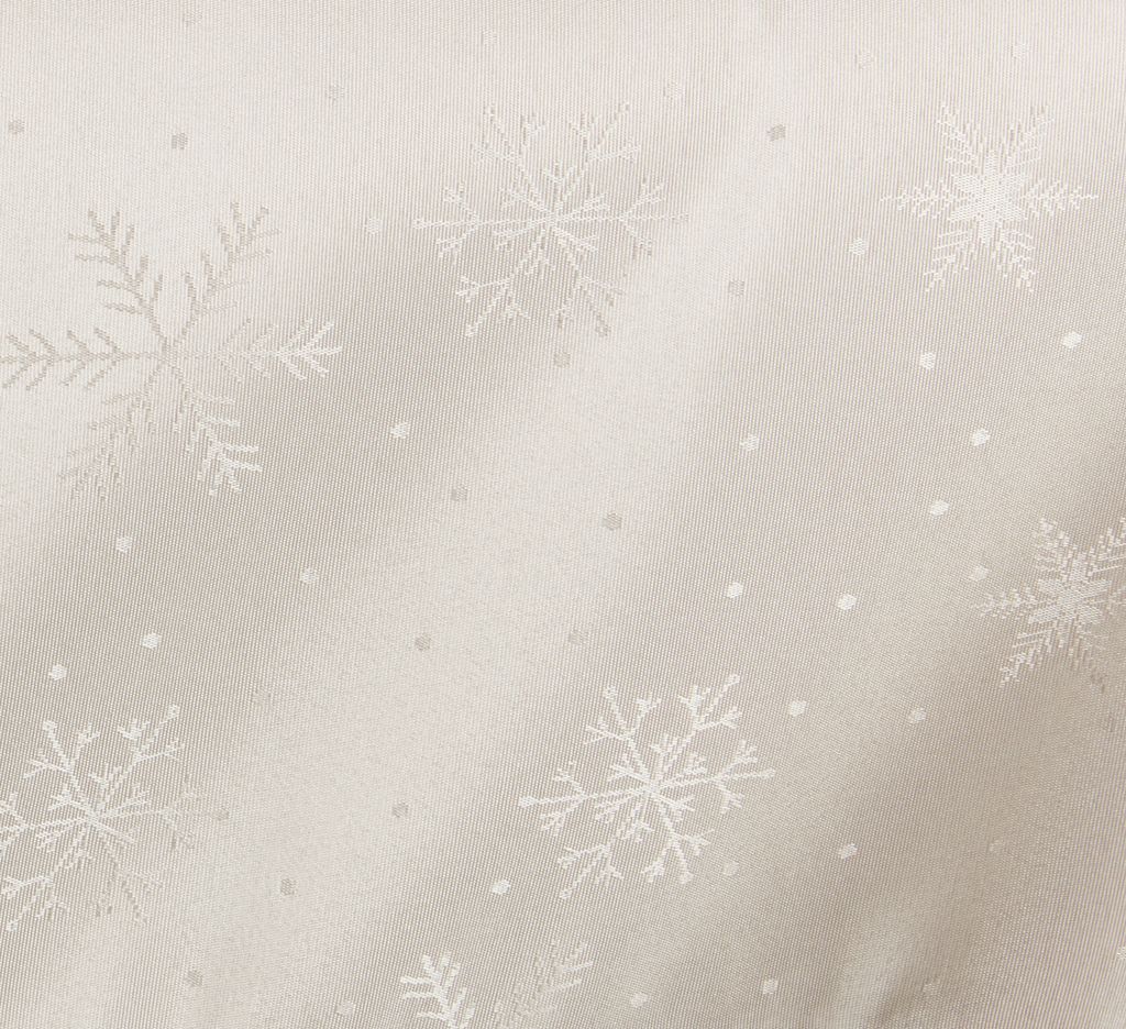 Скатертина елегантного бежевого кольору зі 100% поліестеру (50% переробленого). Прикрашена витонченим візерунком зі сніжинок, що додасть зимової атмосфери вашому святковому столу. Скатертина має водостійке покриття, яке допомагає захистити стіл від рідини та плям. 140x240 см