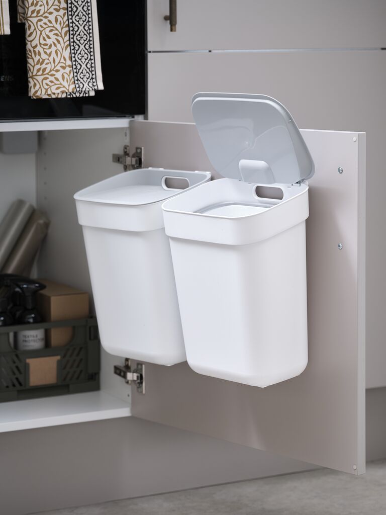 Kifejezetten ajánlom mindenkinek, aki helytakarékos ÉS egyben visszafogottan dizájnos szemeteskukát keres. Valóban felerősíthető a termék az ajtó belsejére, de nagy előnye, hogy megáll a padlón is. A műanyag érintésre kellemes, nem kelt olcsó benyomást az ára ellenére sem. A terméken belül egy pár felragasztható matrica rejtőzik, amivel jelölhető, hogy műanyagot, konyhai hulladékot vagy papírt tárolnánk e benne.